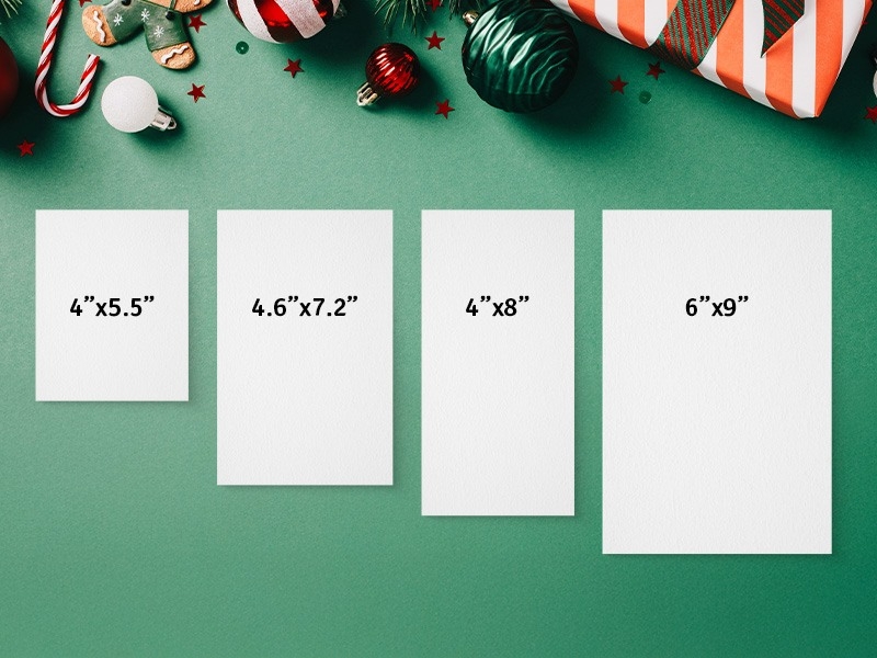Our holiday cards are available in four sizes: 4x5.5, 4.6x7.2, 4x8, and 6x9, giving you flexible options for different messages and mailing needs.